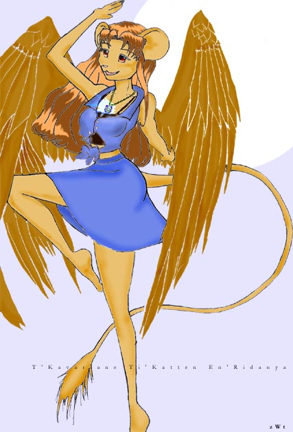 She's lovely here, drawn just as I requested when, unexpectedly, Zhou asked if he could draw her for me. She's dancing, wings curling around her in mid-turn. Thank you so much! ^-^